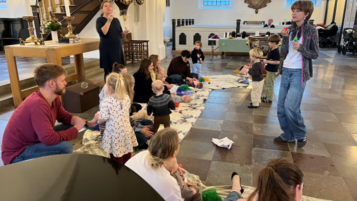 Her synger og bevæger vi os, vi bruger forskellige ting, der stimulerer babyerne, alt sammen i en hyggelig og uformel ramme skabt af vores erfarne musikpædagog Maria Hørup. Vi beder fast Fadervor inden vi slutter.